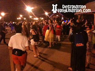 We meet up at Blizzard Beach, many in costume. A DJ was on hand to spin music and ask trivia questions for prizes. The prize? A WDW 40th anniversary Vinylmation. The open window versions you can buy in the stores. Shortly after 9pm, we were bused over to the Magic Kingdom. It was a tiny behind the scenes tour as we drove past the buildings housing some Christmas and ELP parade floats. We ended up behind Splash Mountain and entered the park through Frontierland.